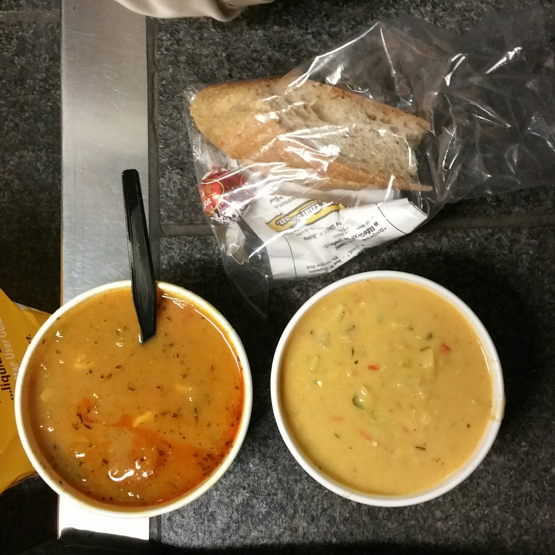 So it was meant to be raining and thunderstorming all day. So what better to have for lunch than the original soup man soup! As continues our tradition of going to places because of their pop culture references, this place was the inspiration for the Soup Nazi character  in Seinfeld. The soup was good. I had to have the Jambalaya whilst George went with the lobster bisque. Each soup came with crusty bread and an orange too. Seriously good soup.