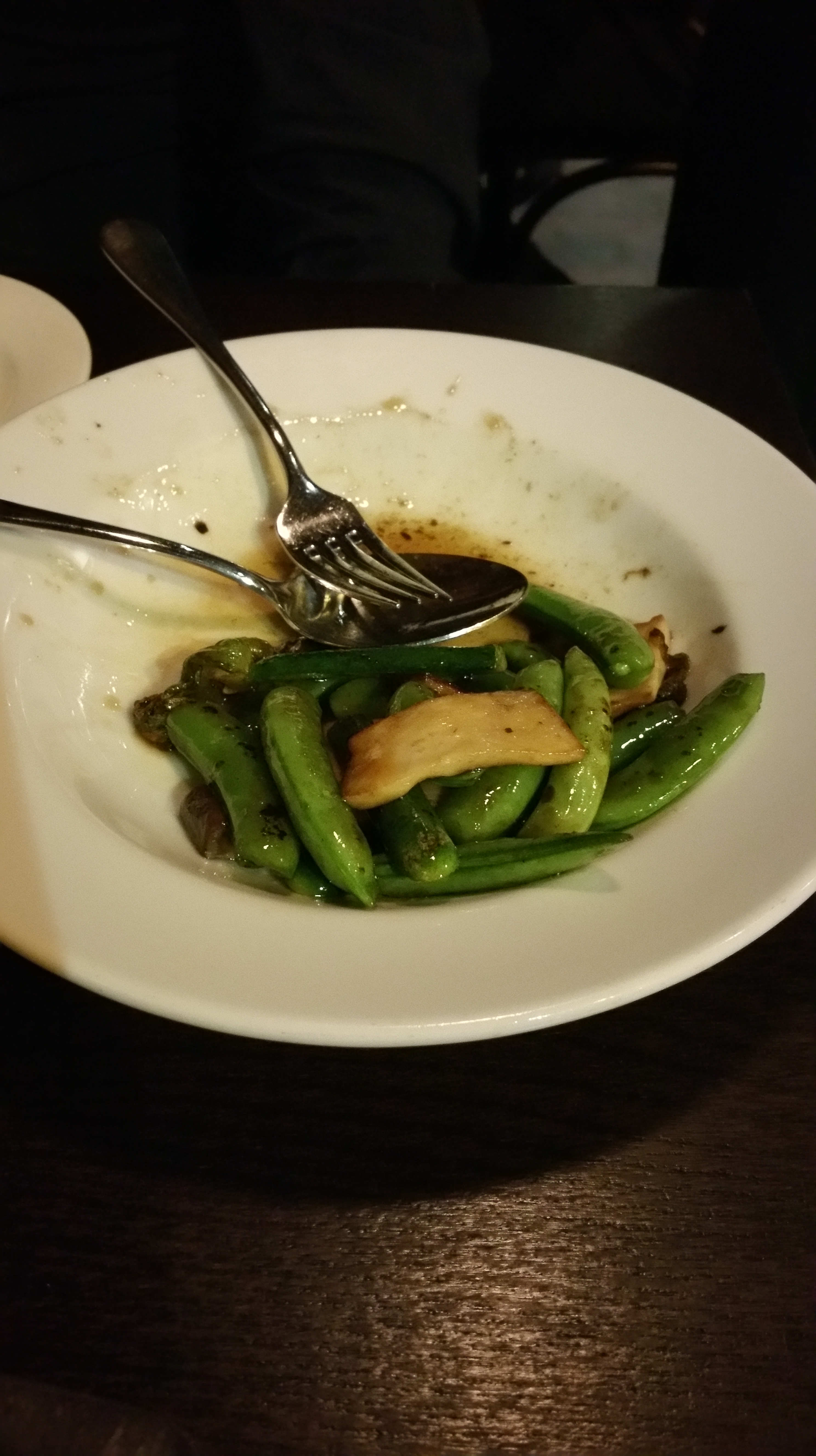 Stir-fried sugar snaps with mushrooms and zuchinni flowers. George decided he couldn’t wait for me to take a photo.