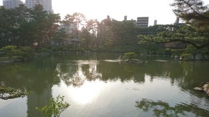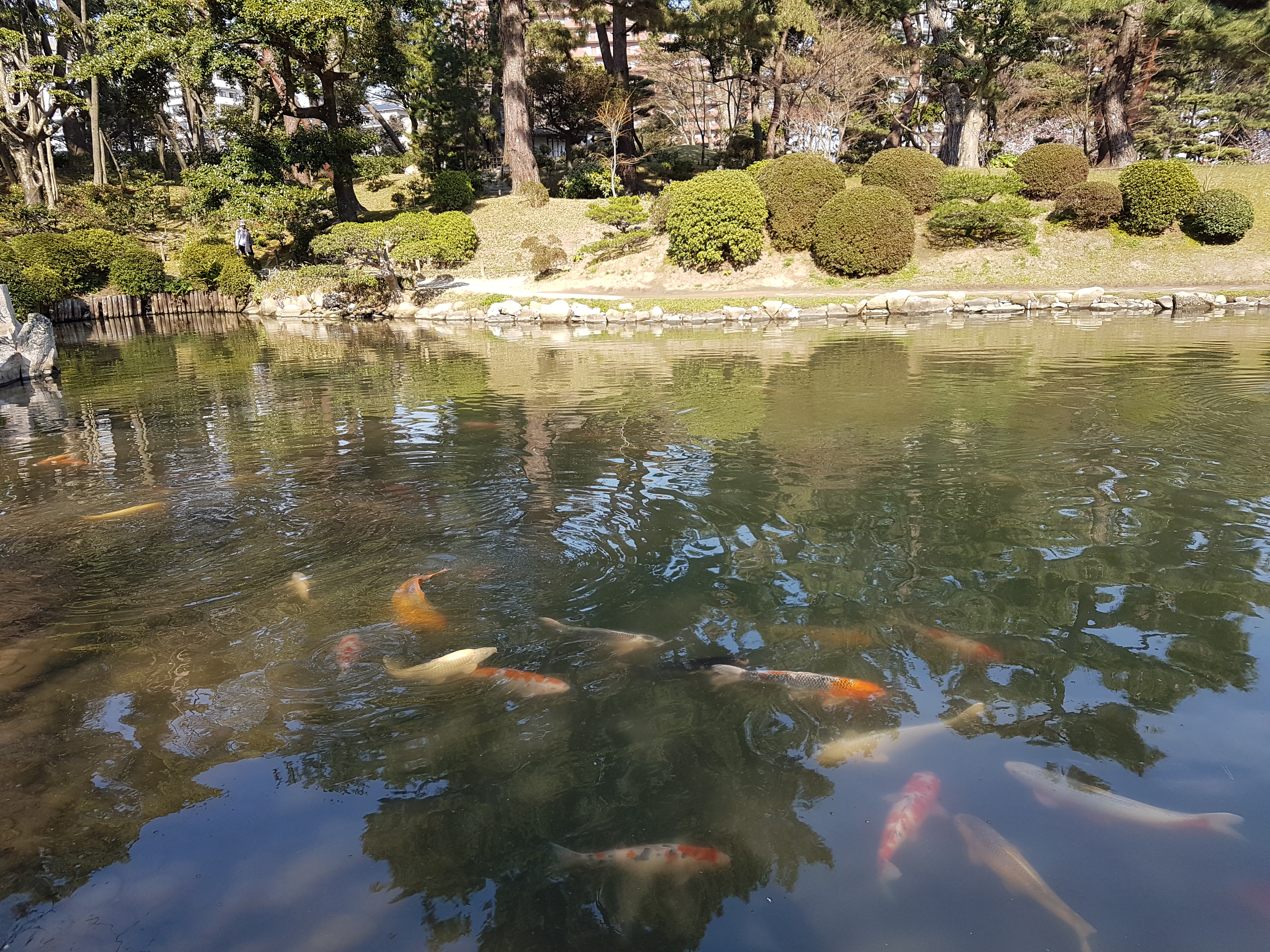 We were even treated to a show by an energetic koi who sporadically jumped out of the water in spectacular fashion. George tried to get a picture of this, but only managed this one (zoom in near the island).