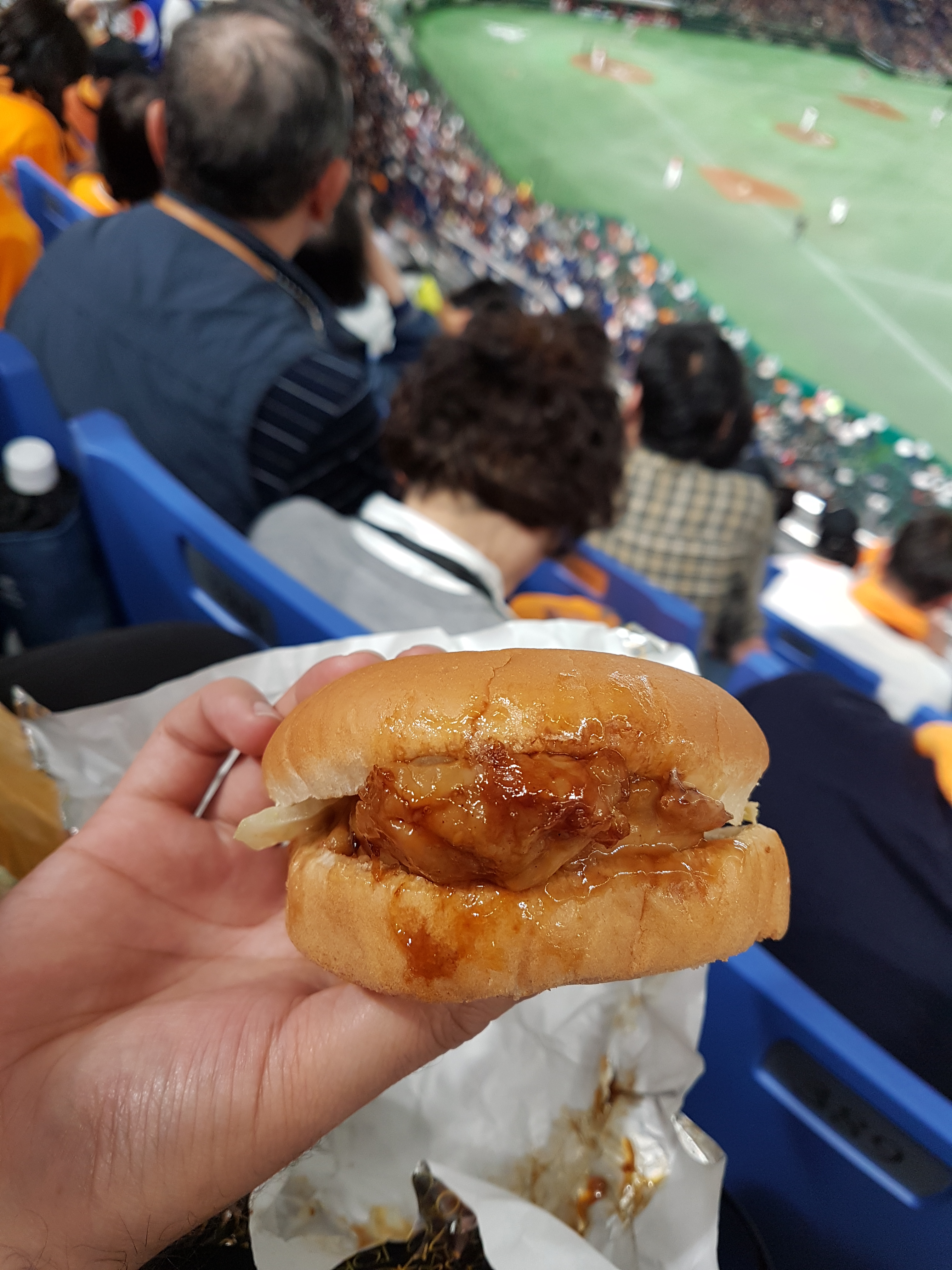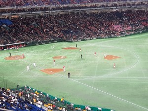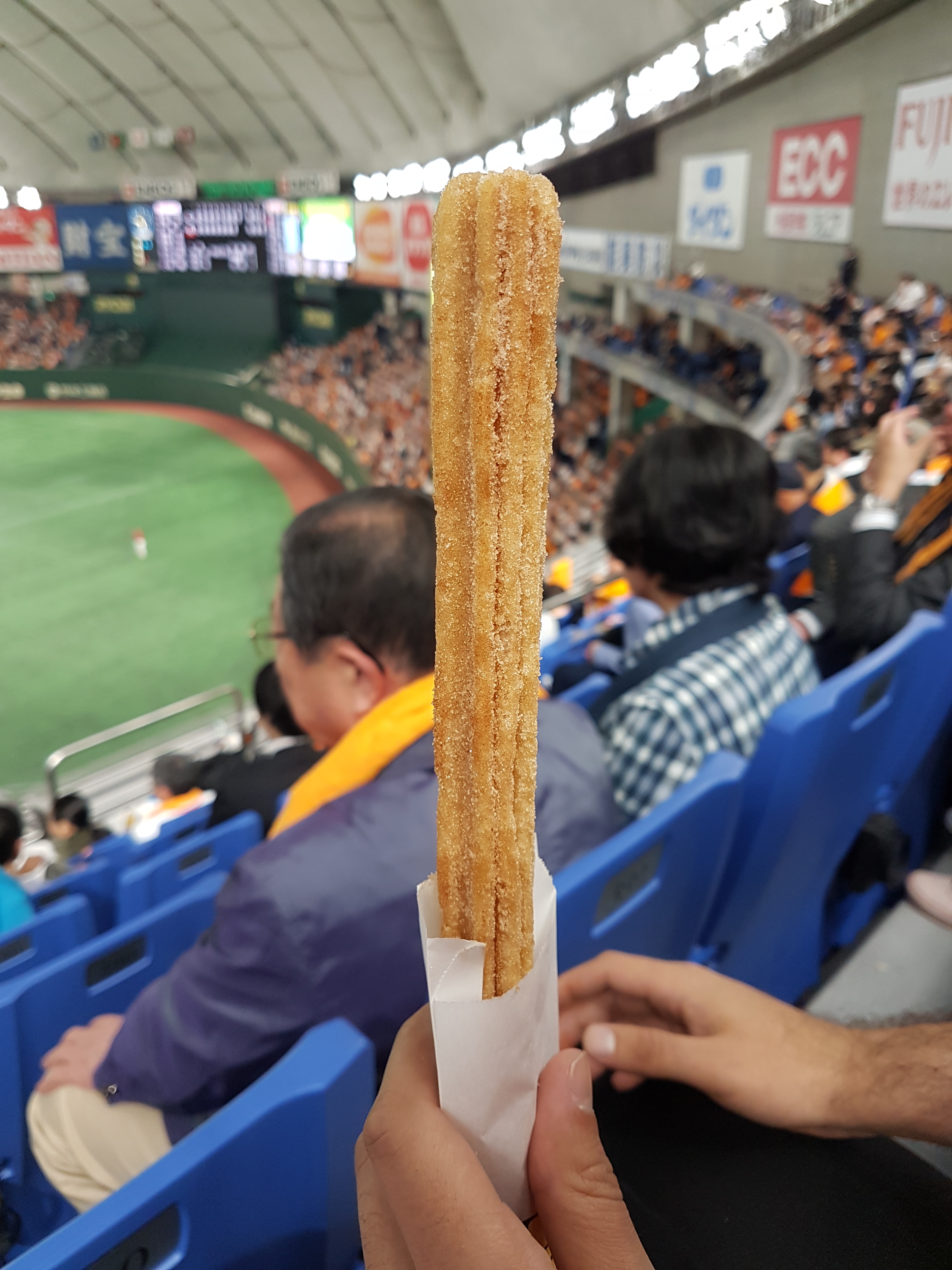 After our lovely stroll through the park, we headed to a post office to pick up our tickets for the evenings entertainment, Baseball! Then headed to the Tokyo Dome to watch our team the Hiroshima Carp take on the Yomiyuri Giants. Now, we went to the baseball in America at Yankee Stadium and we really didn’t have that great of a time. It was more boring than cricket and beer was way too expensive. However, we had good friends who raved about their time at the Japanese baseball and we trusted them :p It was a good thing we did as my word was the baseball so fun! It was nothing like any other spectator sport I have been to. So noisy, such passionate fans with trumpets and drums and the players really got into it too. Also stuff happened! Like the players actually hit the ball and were sneaking bases left right and centre! It was quite exciting! Oh and the beer girls were so damn cute and freaking strong! Holy hell, they were running up and down the stairs with those huge kegs on their backs. It was insane! And the food! Only in Japan can you find delicious food at a sportsball game!