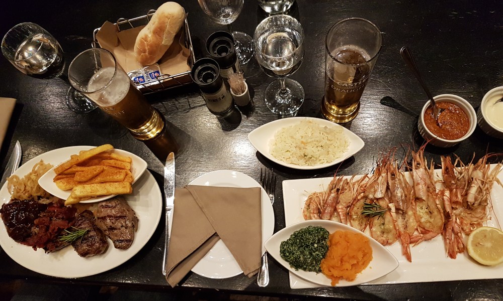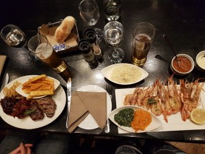 As you can imagine, we were exhausted and a little upset with the situation. We did soldier on, however, and made it to our hotel. Which was extremely nice. All I wanted to do was flop on the huge comfy looking bed and sleep, but we had dinner reservations at a restaurant in the complex so out we went. I’m so glad we did. Tribes was amazing. The decor and service were fantastic. But the food… The food was the standout. We decided on the Peri Peri prawns and the mixed game platter which had kudu, ostritch, warthog and impala.