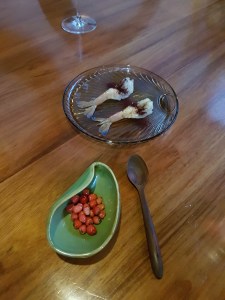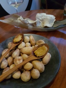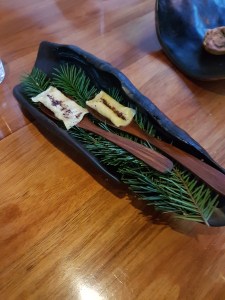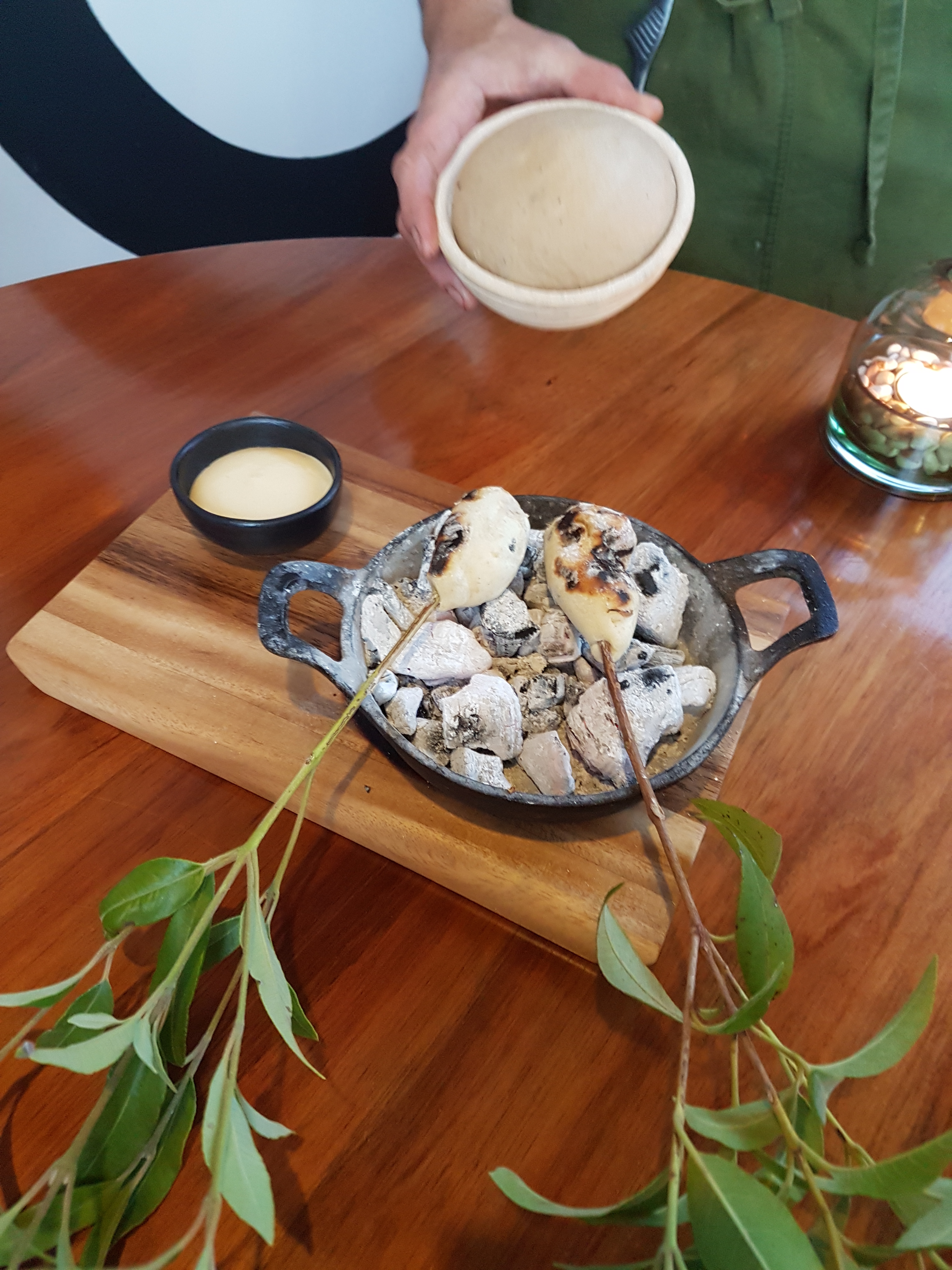 Potato damper baked over hot coals on a eucalyptus branch with roast lamb butter. You read that correctly, it was roast lamb fat in the butter. The dough at the back was actually sour dough that was baked during our first few courses so we could enjoy it hot and fresh a little later.