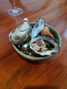 Oyster, oxalis and boobialla. Oxalis and boobialla are types of plants and made up the dressing for the oyster.