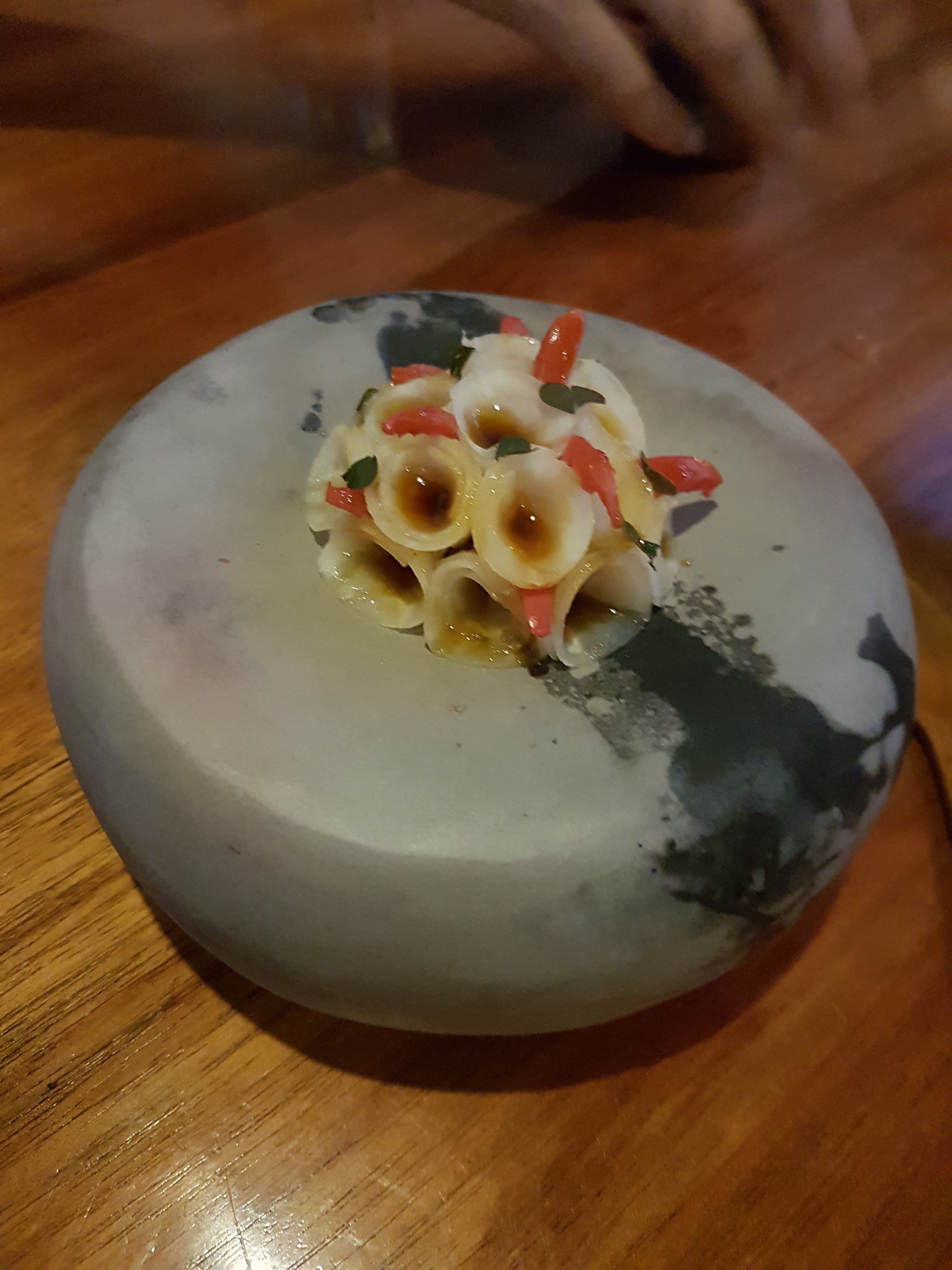 Sea urchin & fermented lamb and a jerked kangaroo tendon. The flavour of the sea urchin was quite rich and not as fishy as I thought it would be. It was my first time eating sea urchin. The jerked kangaroo tendon had the texture of a prawn cracker and not much flavour itself which is why on the base of the tendon was a native fruit paste.